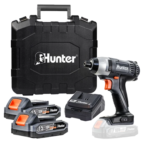 - מברגת אימפקט נטענת 18V כולל 2 סוללות 1.5Ah ומטען 3A של Hunter. כלי ורסטילי וחזק המתוכנן לעבודה עם חומרים ומשטחים קשים ורכים.