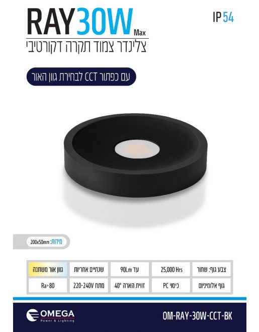 גוף תאורה צלינדר 30W מוגן מים IP54 צמוד תקרה דקורטיבי בעיצוב מודרני דגם RAY כולל כפתור CCT לבחירת גוון אור רצוי 3000K-6500K צבע שחור OMEGA